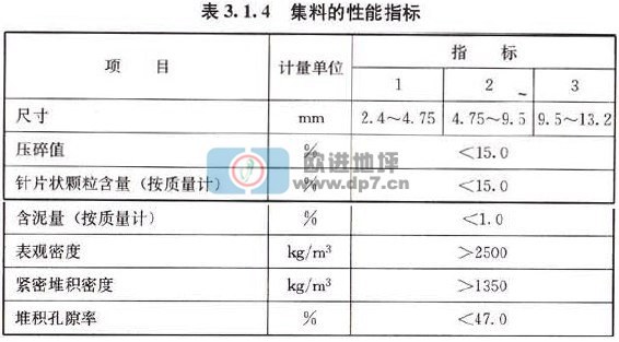 3. 1.4透水水泥混凝土采用的集料,必须使用质地坚硬、耐久、洁净、密实的碎石料,碎石的性能指标应符合现行国家标准《建筑用卵石、碎石》GB/T 14685中的二级要求,并应符合表3.1.4规定。