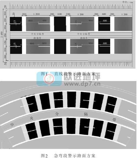 彩色警示路面的设计理念源于上述的彩色警示路面的作用原理和色彩心理学,通过色彩组合和图形比例搭配,在路面构成一幅具有警示作用的彩色路面铺装层,这在事故多发段的警示作用尤为突出。
