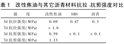 (1)改性焦油(比例1)与其它沥青材料抗拉、抗剪强度对比,结果见表1。
