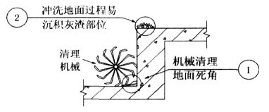 ①基层面垃圾多采用机械清理,由于机械本身的局限,墙脚、柱脚等凸出构件根部阴角附近的垃圾往往清理不到,形成薄弱环节。地面清理过程应认真对待。