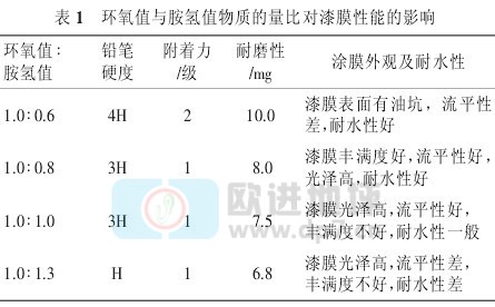 环氧值与胺氢值物质的量比对漆膜性能的影响在影响水性环氧地坪涂料的诸多因素中,环氧脂与固化剂的配比最为重要,主要是指环氧值与胺氢值物质的量比[5]。考察环氧值与胺氢值物质的量比对漆膜性能的影响,试验结果见表