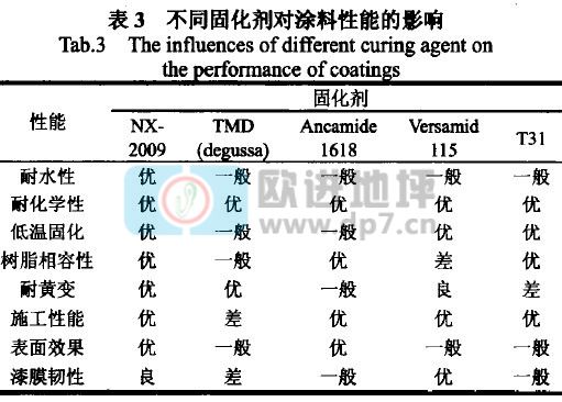 环氧树脂本身是一种热塑性高分子,单纯的环氧树脂本身并没有多大的价值,只有加入固化剂使它转变为三维网状立体结构,才能呈现其优异的性能。目前无溶剂自流平地坪涂料使用的主要固化剂有脂肪胺及其加成物、脂环胺及其加成物、聚酰胺及其加成物、酚醛胺等。通常选用的固化剂中应该含有抗白花、耐酸、低温固化(5~10℃)、耐黄变、抗水斑的成分,以避免无溶剂环氧自流平地坪涂料在低温、高湿的环境下施工可能出现的油斑和白花现象,因此固化剂的选择至关重要。试验中采用了五种固化剂,分别与同一色漆搭配制备涂膜,观察了它们对涂膜性能的影响,结果见表3。