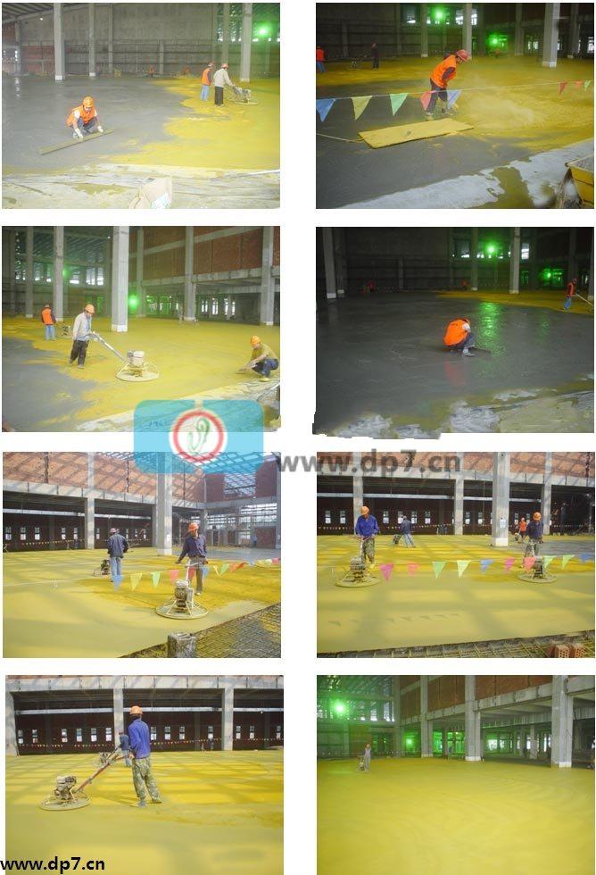 混凝土用水泥基耐磨材料(金刚砂加一定比例的硬化剂拌和而成)。耐磨材料用量4~6Kg/m2(推荐使用5 Kg/m2)。