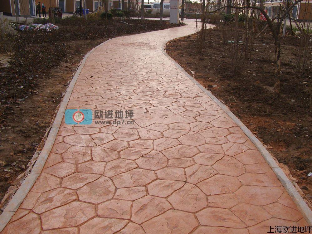 13. 依照参照线压模之后,迅速取出成型模并有条不紊地按顺序压完所有混凝土的表层。如果施工时遇到有靠墙、边角或其它不规则处,可以使用边角模(软模),但使用时要注意与整体图案的一致与协调。
