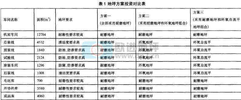 本项目联合厂房建筑面积约3.2万m2,主要包括机加车间、总装车间、预装车间、试车间、涂装车间、后装车问、毛坯库、外协件库、成品库等区域,各区域地坪方案对比分析如下:(如表I)。
