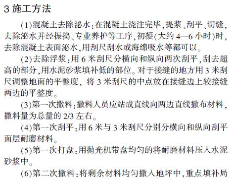 摘要:金刚砂耐磨地坪是由金刚砂、特种水泥和聚合物添加剂混合而成,该地坪与新浇筑混凝土同时施工,将其均匀撒布在初凝阶段的混凝土地坪表面,经专用磨光机打磨,即可在基础混凝土上形成一层致密、高强度的耐磨损面层,可广泛用于需要增强表面特性的混凝土面层。