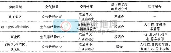 人文条件为透水地坪路面使用的人文环境.城市按区域功能的不同可分为工业区、商业区、文教区、住宅区、观光区等,不同功能区的空气环境不同.由下表可知,透水路面对使用环境中空气质量的要求很高,一旦孔隙阻塞,维护、维修较困难.因此,本研究认为,我国在进行透水路面工程选址时,应充分考虑人文条件,将透水路面建在适宜的地区一重工业区空气悬浮物多,易阻塞面层孔隙,故不宜建透水路面;透水路面最宜建在空气质量与环境卫生较好的文教区、住宅区和观光区.城市各功能区域空气特征及建设透水路面的适宜程度列于下表。