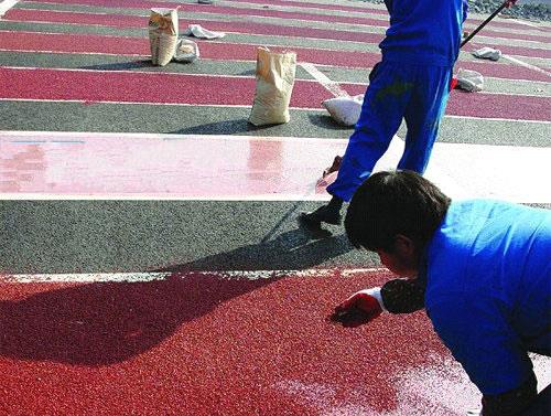 铺撒彩色集料:不同颜色要错开施工,以免颜色相混。