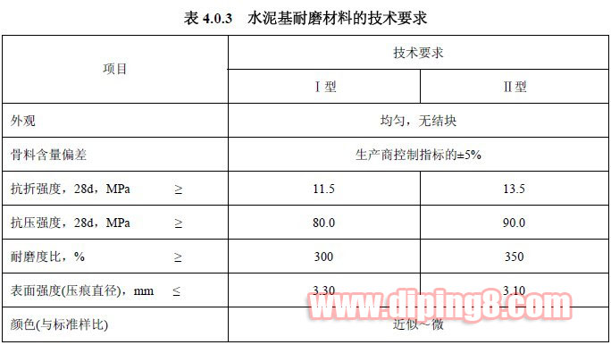 水泥基耐磨材料的骨料含量应在质保书中明示,其性能指标应符合表 4.0.3 的规定。