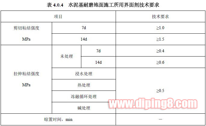 水泥基耐磨地面施工所用界面剂性能应符合表 4.0.4 的规定。