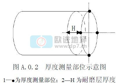测量耐磨层厚度时,应将芯样放置在温度(20~25)℃、湿度(45~55)%的环境中干燥;芯样干燥后,随机抽取两条互相垂直的直径,从芯样外侧测量这两直径与圆周四个交点处的部位的 H(图 A.0.2),以 4 个测量值的算术平均值表示该芯样的耐磨层厚度,测量和计算均精确到 0.1mm。