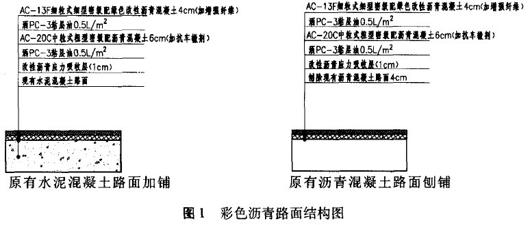 随着“公交优先”发展战略的持续推进,彩色沥青在我国的应用已从单纯的景观铺装进入可以起到强烈的区划、警示作用的“公交优先车道”阶段。广州首次在中山大道公交系统(BRT)试验线工程中采用了绿色沥青公交专用道,设计路面结构形式为:原有水泥混凝土路面加铺两层沥青面层、原有沥青混凝土路面先刨除4cm沥青混凝土再加铺两层沥青面层,如图所示。上面层彩色沥青为AC一13F细粒式细型密级配绿色改性沥青混凝土(加增强纤维)。