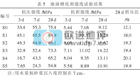 地面硬化剂强度试验的配合比见表4。试件的成型按JC/T 906—2002《混凝土地面用水泥基耐磨材料》中有关规定进行。砂浆成型后先在温度(20±3)℃、相对湿度80%以上的条件下湿养护2d,再放入(20±1)℃的水中养护5d,之后置于(20±3)℃、相对湿度60%的条件下养护21d。按GB/T17671—1999《水泥胶砂强度检验方法(ISO法)》进行强度试验,结果列于表5中。