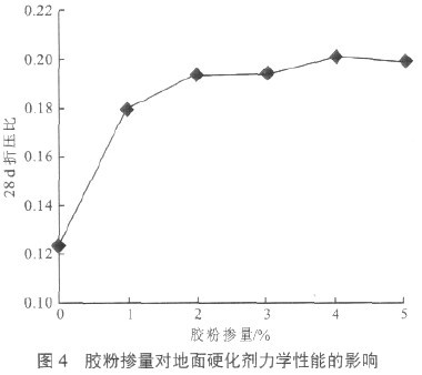(3)如图4所示,28d折压比随胶粉掺量的增加呈上升趋势,当胶粉掺量为1%、2%时折压比快速增长,超过3%的掺量时,折压比增长缓慢,折压比可提高64.5%。可以认为适当掺量的胶粉可明显地改善地面硬化剂的韧性。