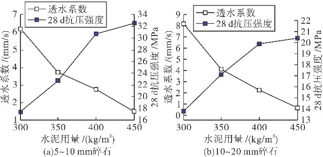(2)粗骨料的级配与粒径对透水混凝土的性能有显著影响,粒径较小的粗骨料配制的透水混凝土强度较高,但透水系数相应降低。为保证透水混凝土的设计强度,应当选择合适的骨料级配与粒径。